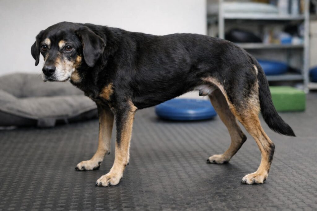 Majitelia často opisujú stav psa ako „schudol“, „trčia mu kosti“ alebo „má úzke stehná“. Nie vždy však ide o chudnutie v zmysle úbytku tukovej hmoty. Často ide o selektívny úbytok svalov, ktorý býva viditeľný najmä na svaloch panvových končatín (v oblasti gluteálnych a stehenných svalov), ďalej na svaloch okolo lopatky a výrazne aj na paraspinálnych svaloch v obla11sti chrbtice.